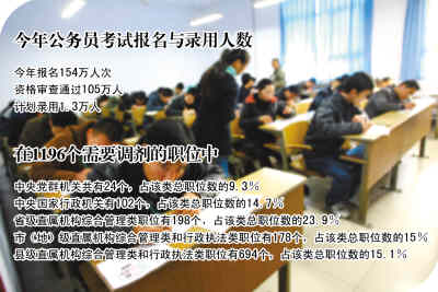 在7555個職位中,共有1196個職位沒有合格人選,或者合格人選未達到規(guī)定面試比例,其中有586個職位報考人數(shù)本身就未達到規(guī)定的面試比例,甚至無人報考。主管部門分析發(fā)現(xiàn),這些職位主要是艱苦、邊遠、基層職位和專業(yè)特殊的職位,也有部分職位是由于設置不合理的資格條件,導致報考人員和過線人員較少。