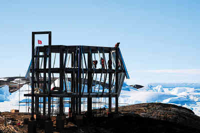 溫度、風(fēng)速、氣壓這些天氣數(shù)據(jù)實(shí)時(shí)地顯示在餐廳內(nèi)的液晶電視屏幕上。這兩天早上的風(fēng)刮得都比較緊,今天的風(fēng)就有六七級(jí),陣風(fēng)8級(jí)。地處東南極大陸沿海,中山站正在南極大陸平均風(fēng)力最大的區(qū)域內(nèi)。去年冬天最大風(fēng)速曾達(dá)到40多米每秒。中山站改造項(xiàng)目經(jīng)理劉篤斌決定等風(fēng)小一些再讓隊(duì)員們?nèi)ヅ栏吒苫。對于站上接二連三立起來的鋼結(jié)構(gòu)新樓,老劉一拍胸脯說,“基礎(chǔ)打得特別深,再大的風(fēng)也能頂?shù)米!?/p>