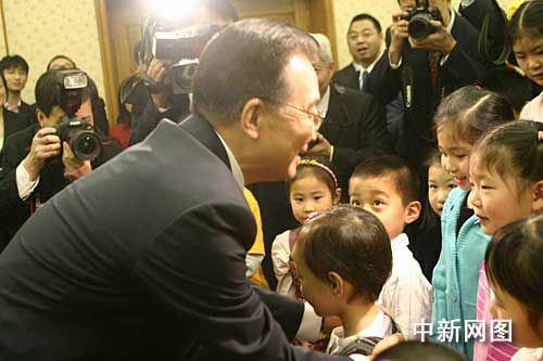 當(dāng)?shù)貢r間二月一日中午,正在訪英的中國總理溫家寶來到使館看望中國駐英外交官和華僑華人。一群衣著鮮艷的孩子向溫家寶獻上鮮花,并齊聲朗誦溫家寶的詩作《仰望星空》。溫家寶親熱地探下身與孩子們問好。中新社記者 張朔攝