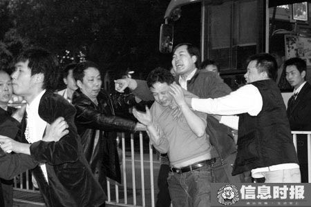 在現(xiàn)場(chǎng),記者看到該名穿淺紅色衣服的男子在不停打電話,該名男子身高大概1米65左右,情緒暴躁,揮舞手臂。在接受警方調(diào)查時(shí),該名男子忽然一拳將旁邊面包車司機(jī)的兒子陳家文打倒在地。隨后還推開前來執(zhí)勤的交警。“你們?nèi)枂,知不知道我是誰?”該名男子向人群叫囂,現(xiàn)場(chǎng)一片混亂。 (信息時(shí)報(bào))
