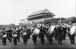 1950年10月1日,中國人民迎來了共和國的第一個生日。500名軍樂隊員在廣場上站立演奏了好幾個小時之后,在總指揮晨耕的指揮下,邁著矯健、整齊的步伐,演奏著激揚(yáng)、堅定的《中國人民解放軍進(jìn)行曲》,最后行進(jìn)通過天安門廣場,接受毛主席檢閱。望著一排排朝氣蓬勃的軍樂戰(zhàn)士,毛澤東主席高興地頻頻揮手,高喊:“人民萬歲!軍樂團(tuán)萬歲!”隨后轉(zhuǎn)過身來對聶榮臻說:“我們中國這么大,人口這么多,要成立千人軍樂團(tuán)。”