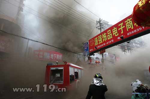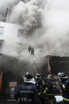 當日上午9時51分,武漢市119指揮中心接到火災報警后,立即調集21個消防中隊、79臺消防車、322名消防官兵趕赴現(xiàn)場進行撲救。發(fā)生火災的華貿商城為一幢9層商住樓,一樓為經(jīng)營門面、2樓和3樓為倉庫,4樓以上為居民住宅。