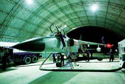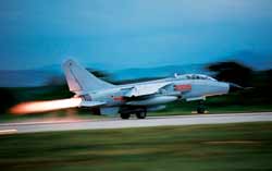 “1號請求起飛!薄鞍从(jì)劃執(zhí)行!币磺袦(zhǔn)備就緒后,塔臺指揮員干凈利索地下達(dá)了命令。18時(shí)25分,該團(tuán)團(tuán)長李軍第一個駕駛“飛豹”戰(zhàn)機(jī)沖向跑道。頓時(shí),機(jī)場上響起巨大轟鳴聲,震得記者耳朵嗡嗡作響;,加力,起飛,戰(zhàn)鷹閃著亮光騰空而起,噴著橘紅色的尾焰直沖蒼穹,最后消失在茫茫夜色之中。