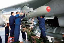 信號彈劃過,剛剛還顯得靜謐的機(jī)場立刻忙碌起來。借助微弱的燈光,記者看到空勤人員一身戎裝迅速就位,地勤人員有條不紊地檢查著“飛豹”戰(zhàn)機(jī);機(jī)場車燈閃爍,各種保障車輛忙而不亂,為戰(zhàn)鷹加油、充電、充氧、掛彈;3輛燈車朝著跑道頂頭駛?cè)ァ?table border=0 cellspacing=0 cellpadding=0 align=left>