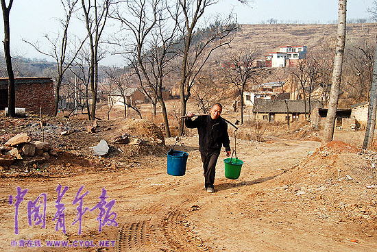“面對(duì)這種情況,鄉(xiāng)里采取兩個(gè)步驟來(lái)解決張溝村人畜吃水難問(wèn)題!本皶悦鲗(duì)中國(guó)青年報(bào)記者說(shuō),“首先是解燃眉之急。春節(jié)后,鄉(xiāng)里組織了4臺(tái)抗旱送水車,和武警部隊(duì)鄭州支隊(duì)的2臺(tái)送水車一起,開(kāi)始為張溝免費(fèi)送水。爭(zhēng)取把每家每戶的水窖都裝滿。我們還準(zhǔn)備再打兩眼深井,把提灌和自來(lái)水的管網(wǎng)配套設(shè)施都弄好,把自來(lái)水送到每個(gè)村民家里!