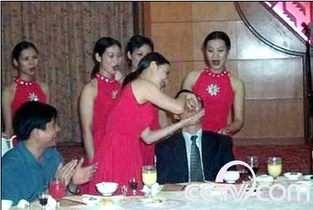 在其上傳的一組圖片中,雖然招待方設(shè)的酒宴依然豐盛,席間各種人物也都頻頻舉杯,但沒有酒店的服務(wù)小姐作陪敬酒。從圖片上可以看到,為了表示對客人的尊敬,招待方只是請了幾名身穿少數(shù)民族服飾的當(dāng)?shù)嘏,站在客人一?cè)陪同敬酒。