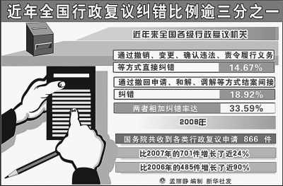 “行政復議化解行政爭議的作用日益明顯。”2月19日,國務院法制辦主任曹康泰在全國行政復議工作經驗交流暨“雙先”、“雙優(yōu)”表彰大會上介紹,2008年,國務院共收到行政復議申請866件,比2006年增長近90%,全國每年通過行政復議化解的行政爭議約8萬件左右。