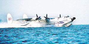 這是一架外形奇特的飛機(jī):機(jī)翼兩側(cè)各垂有一個(gè)巨大的橄欖球狀物,機(jī)腹是傾斜的切割面形狀,好似巨輪的船身?吹接浾咭荒樢苫螅蛋囝I(lǐng)導(dǎo)、政委張汝翼為記者指點(diǎn)迷津:“這就是我們部隊(duì)號(hào)稱(chēng)‘海天鯤鵬’的水上飛機(jī),是全軍僅有的一種特殊機(jī)種,不僅能航行在遼闊的江河湖海,還能馳騁在藍(lán)天之上,機(jī)翼兩側(cè)配有保持浮力和平衡的‘浮筒’……”