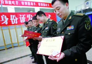 海淀分局人口處民警介紹,去年4月開始,經(jīng)國務(wù)院、中央軍事委員會(huì)同意,在全國范圍內(nèi)為現(xiàn)役軍人和武警部隊(duì)官兵發(fā)放軍人身份證,北京作為試點(diǎn)單位自去年6月先期為駐京部隊(duì)發(fā)放。軍人、武警官兵在社會(huì)活動(dòng)中,如買房、買車、貸款等都可持居民身份證辦理。(記者田北北)