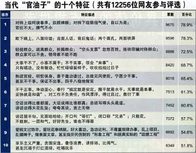 第三個階段:網(wǎng)絡調查。自2009年2月1日—2月12日,“官油子具備哪些特征”的專題調查(分為18條“官油子”特征評選和公眾對“官油子”的態(tài)度調查兩個部分)在人民網(wǎng)、新浪網(wǎng)、騰訊網(wǎng)、人民論壇網(wǎng)等網(wǎng)絡上推出。為什么選擇這幾家網(wǎng)站?因各網(wǎng)站的主要受眾群體不同,如人民網(wǎng)主要面向黨政干部,新浪網(wǎng)、騰訊網(wǎng)等為商業(yè)性網(wǎng)站,受眾面更廣,如此能夠體現(xiàn)更加廣泛地參與性,以使調查更具代表性。網(wǎng)絡調查推出短短十幾天的時間,即受到了廣大網(wǎng)友的熱情參與,共有12256人參與。在廣大網(wǎng)友的共同參與下,我們按照得票數(shù)的多少,列出了“官油子”的十種特征。