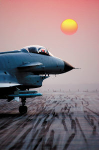 8時30分,一顆綠色信號彈劃過天際,隨之,一陣如雷的轟鳴聲在跑道上滾動。剎那間,威武、勇猛的殲-10雙機編隊,短距滑跑,如離弦之箭直插藍天。飛行員技術熟練,協(xié)同默契,表明了他們對新戰(zhàn)機的掌握已具相當水平。