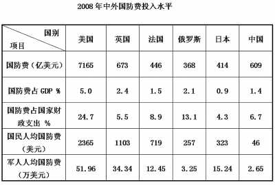 首先,應(yīng)當(dāng)看到中國國防費(fèi)的投入是適度有限的。近年來,中國的國防費(fèi)有了較大幅度的增長,似乎中國的國防費(fèi)已經(jīng)很多了,但如果以歷史的、聯(lián)系的,而不是以孤立的、片面的觀點(diǎn),來審視和分析中國的國防費(fèi)問題,就會(huì)得出一個(gè)中國的國防費(fèi)投入實(shí)際上并不多的客觀結(jié)論。從歷史上看,中國國防費(fèi)投入的增長帶有明顯的補(bǔ)償性。根據(jù)國家統(tǒng)計(jì)局有關(guān)公開資料,從1979年到1989年,國防費(fèi)平均增長為1.23%,與同期居民消費(fèi)價(jià)格總指數(shù)平均上漲7.49%相比,實(shí)際年平均負(fù)增長超過6%。從1990年到1997年國防費(fèi)年均增長15.8%,而同期居民消費(fèi)價(jià)格總指數(shù)平均上漲9.7%,中國國防費(fèi)排除物價(jià)因素后實(shí)際年均增長只有6.1%。直到1998年國家物價(jià)指數(shù)比較平穩(wěn)之后,為降低長期經(jīng)費(fèi)不足給國防和軍隊(duì)建設(shè)帶來的影響,國防費(fèi)投入才逐步有了較大幅度的實(shí)際增長。在長達(dá)10多年的“忍耐”過程中,中國國防和軍隊(duì)建設(shè)因經(jīng)費(fèi)不足而受到很大影響。從中國自身的情況看,中國國防費(fèi)的支出也是極其有限的。以這次兩會(huì)公布的有關(guān)數(shù)字為例,2009年中國國防費(fèi)預(yù)算比上一年度執(zhí)行數(shù)增加了14.9%,占全國財(cái)政支出預(yù)算的6.3%,與前幾年相比,所占比重略有下降,而同期教育費(fèi)增長22.5%、醫(yī)療衛(wèi)生費(fèi)增長20.9%、社會(huì)保障和就業(yè)費(fèi)增長23.1%、環(huán)境保護(hù)費(fèi)增長22.3%、保障性安居工程經(jīng)費(fèi)增長199.6%,可見國防費(fèi)的增長在各項(xiàng)社會(huì)事業(yè)費(fèi)的增長中是相對(duì)偏低的,中國始終堅(jiān)持把主要的財(cái)力用于改善民生。再從國際上看,中國與美、英、法、俄、日等西方國家相比,無論是國防費(fèi)占國家國內(nèi)生產(chǎn)總值(GDP)的比重(%)還是占國家財(cái)政支出的比重,無論是國民人均國防費(fèi)還是軍人人均國防費(fèi)投入等主要指標(biāo)都是比較低的(如下表所示)。