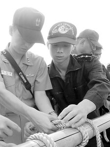 這是一個(gè)海軍基礎(chǔ)課目。海曹抓住纜繩后,用力將撇纜頭拋向預(yù)定區(qū)域。演示完畢,教員要求每個(gè)參訓(xùn)人員都做一遍。