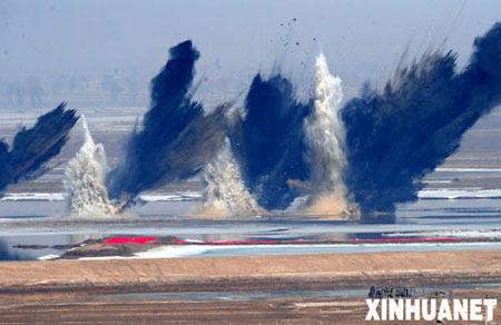 記者看到,這個河段的主河道還被厚冰覆蓋著,大堤外已經(jīng)鋪起一個大大的紅色T字形參照物,這是為飛機(jī)投彈指示方位的。11時25分左右,3架銀色轟炸機(jī)穿過云層,飛抵黃河上空,進(jìn)入投彈區(qū)域。