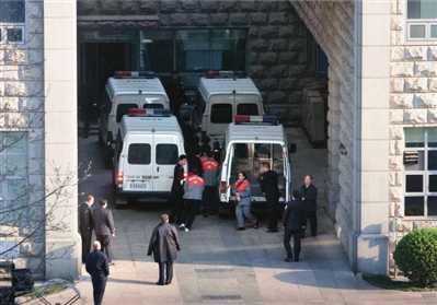 昨天上午8點(diǎn),由4輛囚車(chē)組成的車(chē)隊(duì)呼嘯而至市二中院,進(jìn)門(mén)后徑直開(kāi)到了審判大樓的后面。囚車(chē)停穩(wěn)后,趙鵬運(yùn)等28名被告人被逐一帶入暫看室。記者看到,法院院里停了兩輛120急救車(chē),院外,有近20輛警車(chē)分布在法院周?chē),大批警力在現(xiàn)場(chǎng)維持秩序。