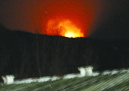 昨晚7時(shí)30分,就在人們都以為大火已被撲滅時(shí),山南側(cè)突然冒出一道火光,隨之升起的煙霧也被火光映成了紅色。大約兩分鐘后,火光漸漸消失。山上只剩下零星的手電筒的“光點(diǎn)”。