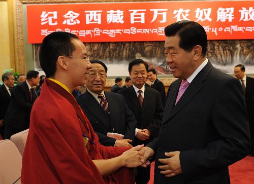 中新網(wǎng)北京3月27日電 紀念西藏百萬農(nóng)奴解放50周年座談會27日在北京人民大會堂舉行。中共中央政治局常委、全國政協(xié)主席賈慶林出席并講話。