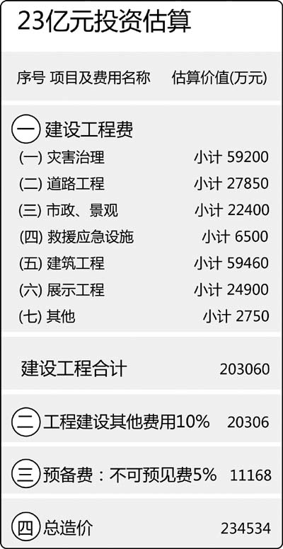 “主題為‘永恒北川’的北川國家地震遺址博物館整體設計方案已經(jīng)有關部門原則性通過,初步預算總投資為23.45億元,資金一經(jīng)劃撥,將即時開建!