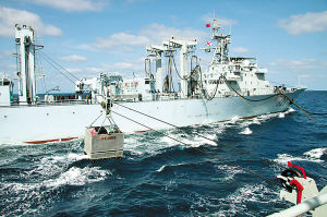 經(jīng)過(guò)9天9夜的航行,今天(注:11日)上午,海軍第二批護(hù)航編隊(duì)的“深圳”號(hào)導(dǎo)彈驅(qū)逐艦和“黃山”號(hào)導(dǎo)彈護(hù)衛(wèi)艦,在阿拉伯海與前出接應(yīng)的第一批護(hù)航編隊(duì)的“微山湖”號(hào)綜合補(bǔ)給艦會(huì)合,并實(shí)施了補(bǔ)給。