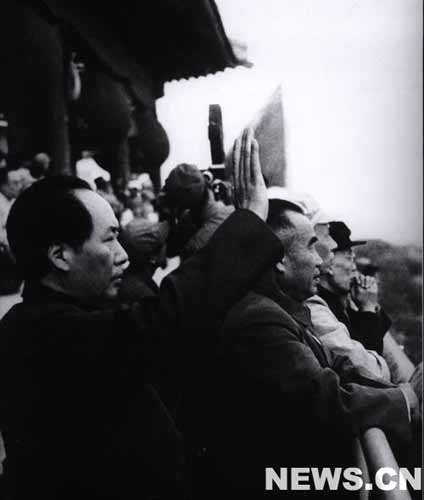 閱兵式接近結(jié)束時,天色已晚,天安門廣場這時變成了紅燈的海洋。無數(shù)的彩色火炮從會場四周發(fā)射。歡呼著的群眾在閱兵式完畢后開始游行。當群眾隊伍經(jīng)主席臺附近走出會場時,"人民共和國萬歲!""毛主席萬歲!"的口號聲響入云霄。毛主席在擴音機前大聲地回答著:"同志們?nèi)f歲!"毛主席伸出身子一再地向群眾招手,群眾則歡呼鼓掌,手舞足蹈,熱情洋溢,不能自己。當游行的隊伍都已有秩序地一一走出會場時,已是晚間九點二十五分。舉著紅燈游行的群眾象火龍似地穿過全城,使新的首都浸在狂歡里直到深夜。(新華社北京1949年10月1日電)