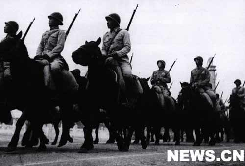 毛主席宣讀公告完畢,閱兵式開始。閱兵式由人民解放軍朱德總司令任檢閱司令員,華北軍區(qū)司令員兼京津衛(wèi)戍區(qū)司令員聶榮臻將軍任閱兵總指揮。朱總司令驅(qū)車檢閱各兵種部隊,回到主席臺上宣讀人民解放軍總部命令。受閱部隊隨即分列經(jīng)主席臺前由東向西行進,前后歷時三小時。受閱部隊以海軍兩個排為前導,接著是一個步兵師、一個炮兵師、一個戰(zhàn)車師、一個騎兵師,相繼跟進?哲姲☉(zhàn)斗機、運輸機、教練機共十四架在全場上空自東向西飛行受閱。在閱兵式中,全場掌聲象波浪一樣,一個高潮接著一個高潮。