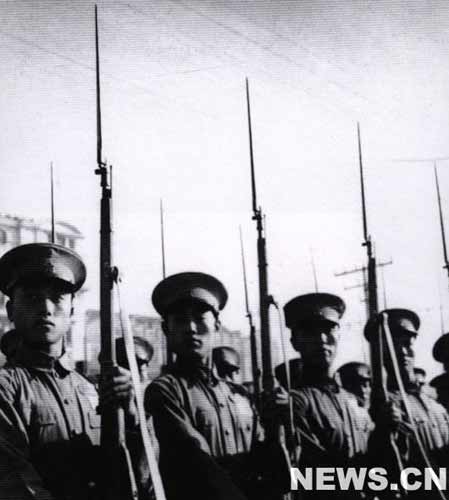 接著前進(jìn)的是民兵大隊(duì)。他們是華北老解放區(qū)民兵的代表,都是戰(zhàn)斗英雄和工作模范,全場熱烈鼓掌向他們表示歡迎。