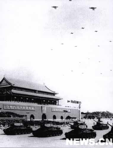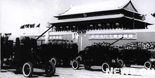 中國(guó)人民解放軍代理總參謀長(zhǎng)聶榮臻乘車(chē)率領(lǐng)武裝部隊(duì)進(jìn)入廣場(chǎng),通過(guò)檢閱臺(tái)前,向西行進(jìn)。全場(chǎng)熱烈鼓掌,向他們表示歡迎。