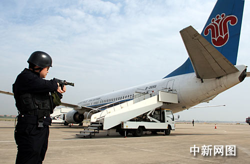 中新網(wǎng)武漢4月28日電 (林樺 陳曉東 田劍清 徐金波)一場驚心動魄的反劫機應急救援綜合演練,28日在武漢天河機場跑道北邊的東航停機坪上演。