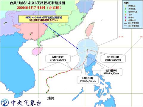 中新網(wǎng)5月7日電 中央氣象臺2009年5月7日10時發(fā)布熱帶氣旋公報:今年第2號強熱帶風暴“燦鴻”于今天上午加強為臺風,上午8時其中心位于東沙群島以南大約590公里的南海中部海面上,就是北緯15.3度,東經(jīng)117.3度,中心附近最大風力有12級(35米/秒)。
