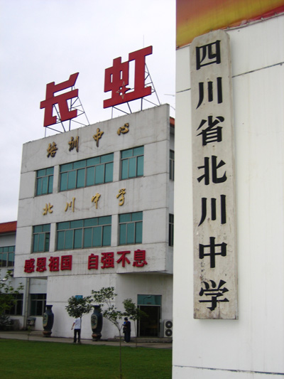“5.12”地震中,北川中學的2800多名師生里有上千人遇難。除了一棟老教學樓,校舍全部倒塌損毀。為了安全,據長虹培訓中心主任侯慶國介紹,地震后第二天,學校的很多師生就轉移到了綿陽市九州體育館。后來在長虹集團的幫助下,北川中學于5月19日在其培訓中心復課。復課儀式上,長虹集團送來了從學校廢墟中找到的校牌——這段故事已成為佳話。