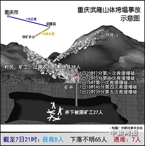 5日下午3時(shí)發(fā)生的重慶市武隆縣鐵礦鄉(xiāng)雞尾山山體垮塌災(zāi)害,直接導(dǎo)致山對面的三聯(lián)采礦場和幾所民居及一些路人被埋。經(jīng)過兩天兩夜的搜救工作,截至7日23時(shí),救援人員已發(fā)現(xiàn)7位遇難者遺體。包括此前救出的8名傷者和證實(shí)2名失蹤者當(dāng)時(shí)不在事故現(xiàn)場外,尚有65人下落不明,其中,被埋井下有礦工27人。