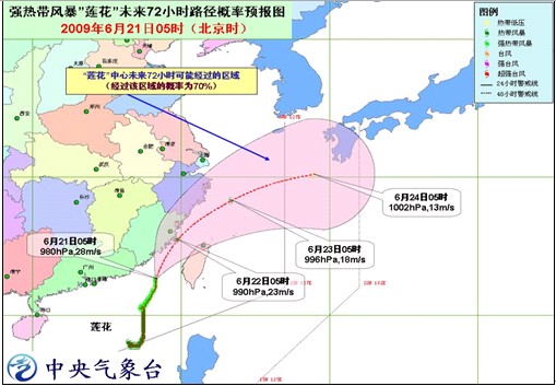 預計,“蓮花”將以每小時15公里左右的速度向北偏東方向移動,逐漸向福建福清到漳浦一帶沿?拷锌赡苡诮裉煜挛绲揭归g在這一帶沿海登陸;也有可能擦過福建省近海海面,沿臺灣海峽向東北方向移動,強度逐漸減弱。