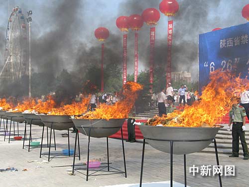 中新網(wǎng)西安6月26日電(記者 冽瑋)6月26日是第22個國際禁毒日,今年的主題是“依法禁毒 構建和諧”。今天上午,陜西省禁毒委在咸陽市統(tǒng)一廣場公開集中銷毀繳獲的313公斤毒品。