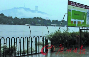 被譽(yù)為中國(guó)足球“明星搖籃”和培養(yǎng)中國(guó)足球裁判員“黃埔軍校”的廣西梧州體育訓(xùn)練基地,位于緊臨西江的梧州市蝶山區(qū)龍湖鎮(zhèn),是原國(guó)家體委與地方共建的全國(guó)三大足球訓(xùn)練基地之一。前日以來(lái),隨著西江水位的不斷上漲,該體育訓(xùn)練基地開(kāi)始不斷被水蔓延。昨日下午,記者趕到時(shí),上百畝訓(xùn)練場(chǎng)地全部被大水淹沒(méi),水深處達(dá)兩米多,球場(chǎng)只露出一截40多個(gè)球門(mén),讓人們還能認(rèn)得出來(lái)這里原來(lái)是一處足球場(chǎng)地。同時(shí),記者也看到附近居民的房屋的一樓已經(jīng)泡在水中。(記者王廣永)