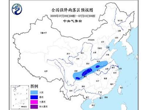 中新網(wǎng)7月9日電 中央氣象臺(tái)今日06時(shí)發(fā)布暴雨預(yù)報(bào):預(yù)計(jì),今天白天到夜間,川西高原東南部、四川盆地東部和南部、重慶西部和北部、湖北西北部、河南南部、安徽北部等地有大雨或暴雨。