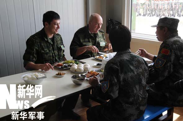 新華軍事:之前你為網(wǎng)友介紹過中方的飲食,按規(guī)定是六菜一湯,比較豐盛。這幾天有沒有機會吃到俄軍的飯菜?他們的飲食狀況是怎樣的?