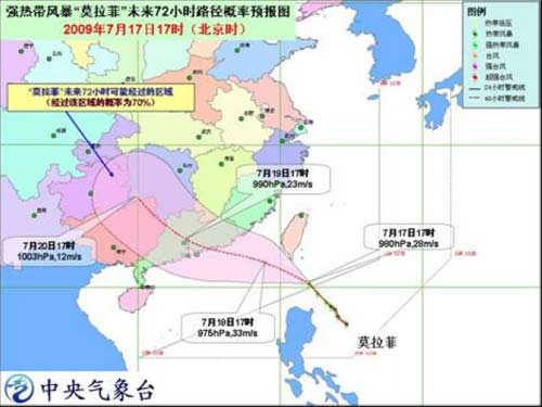 預(yù)計,“莫拉菲”將以每小時20公里左右的速度向西偏北方向移動,強度繼續(xù)加強,18日早晨將進入南海東北部海面,爾后逐漸向福建南部到廣東中部一帶沿?拷⒂18日夜間到19日中午在這一帶沿海登陸。