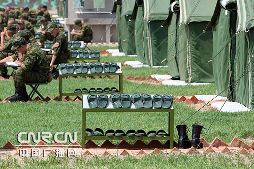 鳳凰衛(wèi)視記者:打靶歸來,第一件事情當(dāng)然是洗澡,不過這樣赤條條穿過軍營(yíng),在中國(guó)記者眼中實(shí)在是過于自由散漫,看來紀(jì)律嚴(yán)明的俄羅斯大兵,訓(xùn)練歸訓(xùn)練,生活還是生活,由中方承建的俄軍野營(yíng)村,規(guī)模不大,但功能齊全,熨斗、網(wǎng)吧、電話亭,各種生活設(shè)施一應(yīng)俱全,面積達(dá)2750平方米的大食堂,每天都為1300名俄羅斯官兵,提供最地道俄式餐飲,雖然食物原料由中國(guó)制造,但17位廚娘清一色都來自俄羅斯,超市內(nèi)琳瑯滿目,應(yīng)有盡有,每一份商品都用中文和俄文注明詳細(xì)的價(jià)格,超市東西雖然便宜,還是要用人民幣來購(gòu)買,所以俄羅斯士兵大都要到這里的貨幣兌換處來把手中的盧布換成人民幣,每100盧布,可以換19元人民幣。兌換處經(jīng)常大排長(zhǎng)龍,但精通俄語(yǔ)的中方工作人員就說,開業(yè)一周以來,這里每天的交易額只是3萬盧布,折合人民幣6300元平均每人每天才兌換5塊錢,不知道是俄軍待遇差,還是俄羅斯經(jīng)濟(jì)衰退的緣故呢?