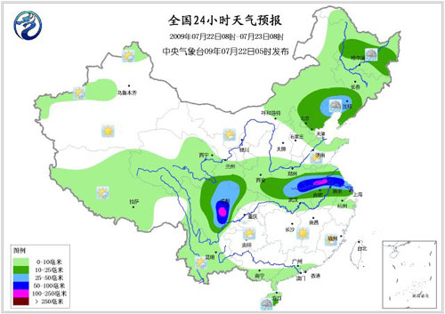 中新網(wǎng)7月22日電 中央氣象臺2009年7月22日06時發(fā)布未來三天天氣趨勢預報稱,江淮黃淮四川盆地江南北部等地有強降水,江南華南西南地區(qū)東部等地仍有高溫。