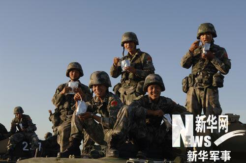 7月21日,在“和平使命-2009”中俄聯(lián)合反恐軍事演習(xí)現(xiàn)場(chǎng),野戰(zhàn)兵站為參演的陸軍戰(zhàn)斗群某裝甲步兵分隊(duì)前送180人份新型野戰(zhàn)自熱食品,讓正在演習(xí)場(chǎng)執(zhí)行任務(wù)無法回野營(yíng)村就餐的參演官兵吃上了熱菜熱飯。這是此次聯(lián)合軍事演習(xí)開始以來首次在演習(xí)場(chǎng)采取野戰(zhàn)自熱食品保障。 (崔秀文、顏云鵬)