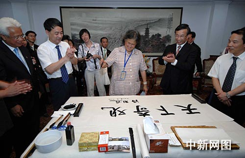 中新網(wǎng)海寧7月22日電 (記者 汪恩民 實(shí)習(xí)生 陳榮輝) 聞名天下的浙江海寧鹽官錢塘潮,受本世紀(jì)最重要的日全食影響,比往年更為壯觀。今天,泰國詩琳通公主殿下慕名專程前來欣賞這兩大天下奇觀后,用毛筆留下了“天下奇觀”的盛譽(yù)。