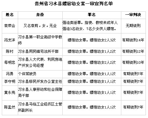 其中,被告人馮支洋(習(xí)水縣第一職業(yè)高級中學(xué)教師)嫖宿幼女2人3次;被告人陳村(習(xí)水縣同民鎮(zhèn)司法所干部)嫖宿幼女1人2次;被告人母明忠(習(xí)水縣人大代表、利民房地產(chǎn)開發(fā)公司經(jīng)理)嫖宿幼女2人2次;被告人馮勇(個(gè)體駕駛員)、李守明(習(xí)水縣移民開發(fā)辦公室主任)、黃永亮(習(xí)水縣人事勞動(dòng)和社會保障局干部)、陳孟然(習(xí)水縣馬臨工業(yè)經(jīng)濟(jì)區(qū)土管所副所長)分別嫖宿幼女1人1次。