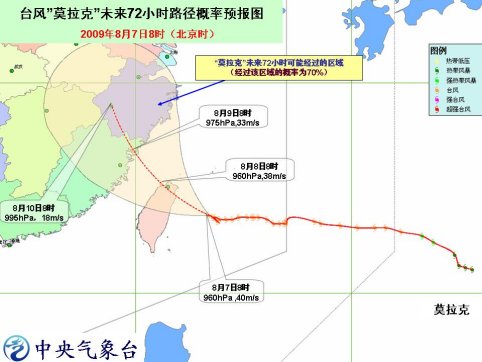 預(yù)計(jì),“莫拉克”將以 每小時(shí) 15 公里左右的速度向西北方向移動,將于今天 傍晚前后登陸臺灣東北部,然后向福建北部到浙江中部一帶沿?拷,并有可能于明天下午到后天早晨在向福建北部到浙江中部一帶沿海登陸。