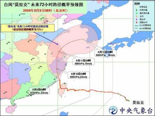 預(yù)計(jì),“ 莫拉克 ” 將以每小時(shí)10公里左右的速度向北偏西方向移動(dòng),并將于今天下午到夜間在福建連江到浙江樂清一帶沿海登陸。