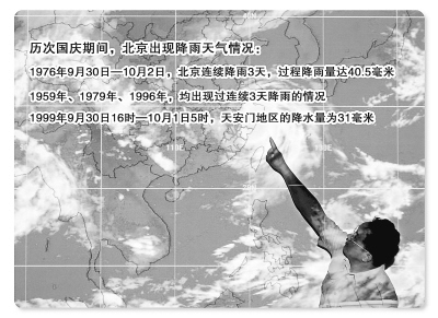 歷次國(guó)慶期間,北京曾經(jīng)出現(xiàn)過(guò)幾次大雨和連續(xù)性降雨:1976年9月30日—10月2日,北京連續(xù)降雨3天,過(guò)程降雨量達(dá)40.5毫米;1959年、1979年和1996年也出現(xiàn)過(guò)連續(xù)3天降雨的情況;1999年國(guó)慶50周年前夜,北京出現(xiàn)降雨,一直持續(xù)到10月1日早晨。9月30日16時(shí)到10月1日5時(shí),天安門地區(qū)的降水量為31毫米,給國(guó)慶活動(dòng)的前期準(zhǔn)備工作造成了影響。