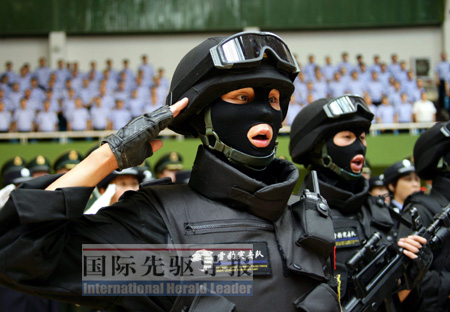 在最繁華的西單商業(yè)街,出現(xiàn)了戴著墨鏡的特警。8月22日,國慶安保巡邏防控啟動儀式在這里進行,百余名由特警、民警、保安組成的巡邏隊伍,在鬧市街頭巡邏。這著實讓百姓們開了把眼界!皠偪吹綍r有一絲緊張,”當天,正在西單逛街的彭女士說:“但覺得很安全,畢竟是國慶嘛!
