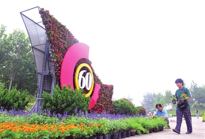 昨天,國(guó)慶60周年大型花壇“普天同慶”基本完工,用鮮花等材料構(gòu)建的“60”及“紅旗”亮相朝陽公園東門。這是今年國(guó)慶第一個(gè)完工的大型花壇,也是城區(qū)公園和環(huán)線要道最具國(guó)慶色彩的花壇。