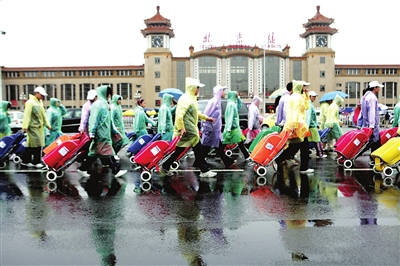 在天安門(mén)前,每隔8米一個(gè)崗哨,每個(gè)武警的腳下,都放著一個(gè)裝著雨衣的布包。下午4點(diǎn)半,因降雨變大,不但武警穿上了深綠色雨衣,長(zhǎng)安街沿街的所有音響也都套上了“雨衣”。