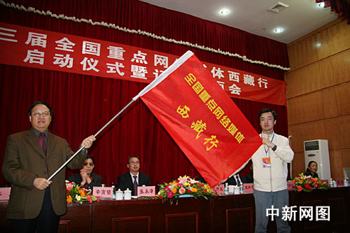 中新網(wǎng)9月10日電 “歷史的跨越 輝煌的成就”——第三屆全國重點網(wǎng)絡(luò)媒體西藏行大型采訪活動今日下午正式啟動。中央和部分省市近30家重點新聞網(wǎng)站的近50名記者齊聚世界海撥最高的新聞發(fā)布大廳,參加了啟動儀式。