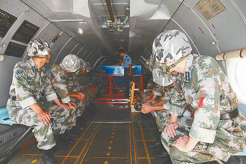 執(zhí)行空中撒播催化劑任務(wù)的是空降兵某團的特種兵們,他們曾多次從這種型號的運輸機上練習跳傘,但這次的任務(wù)是在規(guī)定時間內(nèi),快速將消云減雨的催化劑播撒完畢。